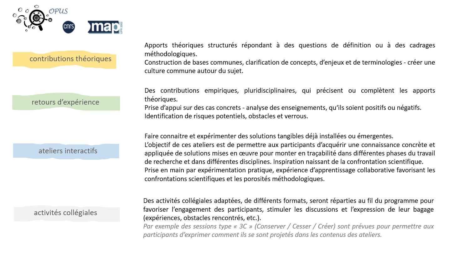 L’école thématique OPUS (Opacités épistémiques: méthodes, solutions et obstacles pour monter en traçabilité) veut rendre compte de l’importance de la transparence des résultats de recherche (et des protocoles mobilisés pour les produire) pour réduire ce que Héder appelle l’opacité épistémique.